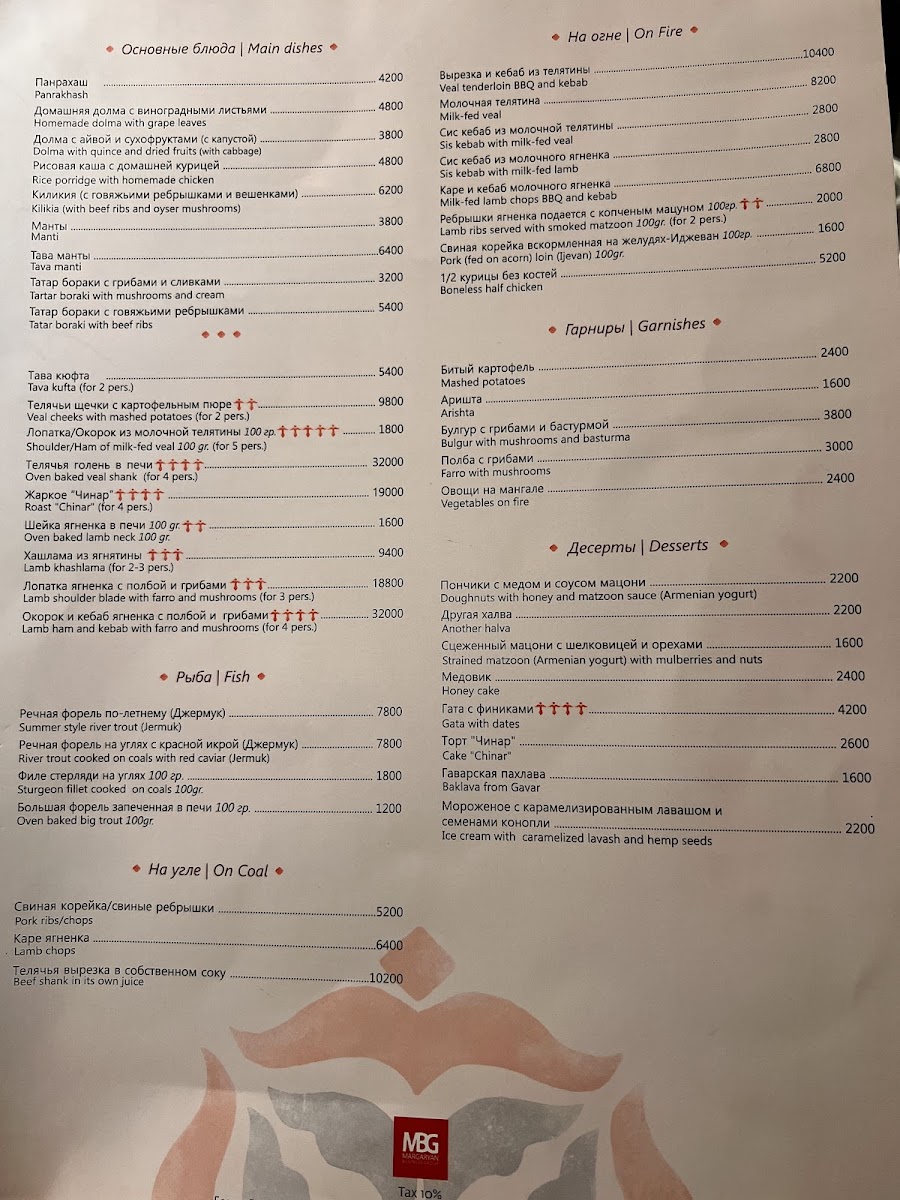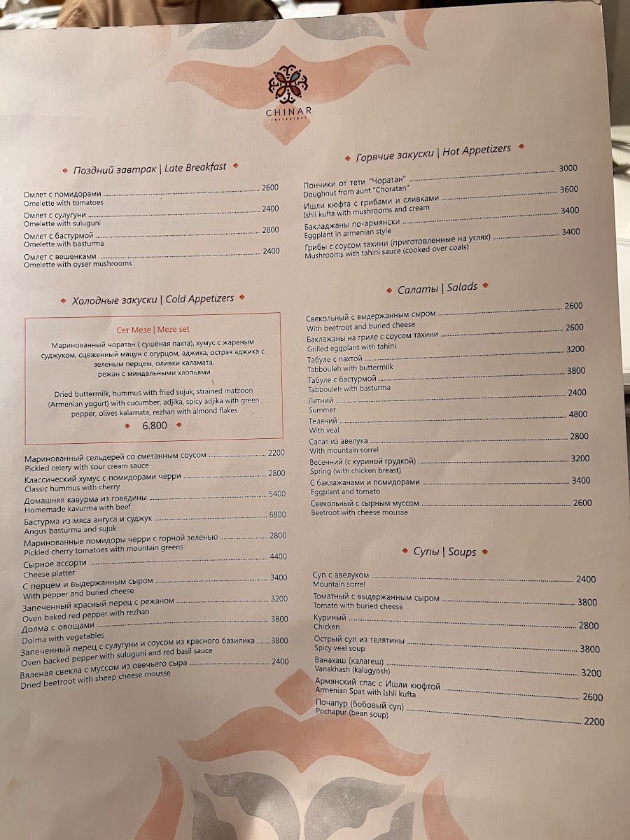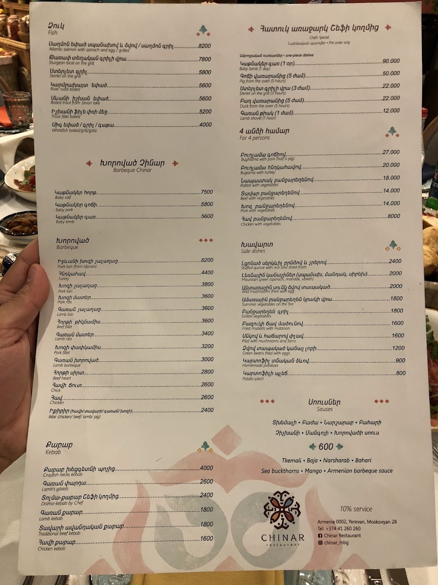 Chinar Restaurant on 28 Moskovyan Street in Yerevan offers a menu that perfectly balances traditional Armenian flavors with refined presentation. The standout dish, Bughlama, showcases tender meat and vegetables cooked slowly to meld rich, hearty flavors that linger pleasantly on the palate. Alongside this, the menu features a variety of well-crafted appetizers, fresh salads, and delicate soups, each thoughtfully seasoned and presented. The combination of generous portion sizes and carefully curated ingredients ensures that every bite is both satisfying and memorable. Complementing the main courses are subtly flavored side dishes and locally inspired accompaniments, providing a complete dining experience that reflects the essence of Armenian cuisine. Overall, the menu at Chinar Restaurant emphasizes authenticity and quality, leaving diners with a lingering appreciation for the depth and richness of each dish, with Bughlama standing out as a true highlight.